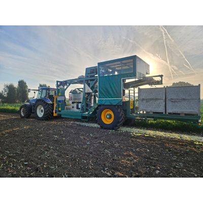 Custom-made machine to harvest cauliflower: New European legislation of 2020. 3 or 6 coals at a time. Double crusher with shake system (+/- 1 % big). Leaf blower. Turntable (4 boxes). Booth above machine & potting belt. Machine levelling (= horizontal at all times). Steered drawbar. Steered wheel axle. LED lighting. Large wheels. UNLIMITED capacity.