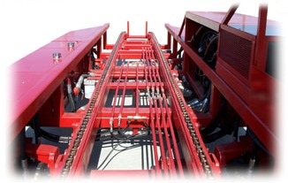 Powerful 4-wheel drive and all wheel steering provides the ability to gel through any orchard condition. Low profile operator platform allows low limbs to pass overhead. Once hand controls the forks and both chains simultaneously always leaving the other hand free to steer. Automatic Bin Locking System locks bins in high-speed transport. Rubber rollers, provide better grip for pickup and eliminate bin damage.