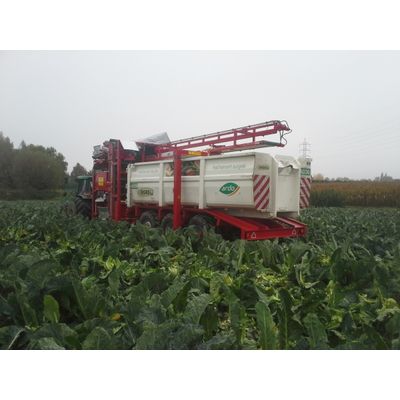 Pivots along the tractor with space at the front and rear for storage of the auction bins. Emergency stop immediately stops the entire machine. NEW: headrail guarantees the balance of the conveyor belt and facilitates sliding along the cart. Electric eye stops the vegetable at the end of the belt to facilitate the picking. Steerable pole keeps the cart in the track of the tractor (even in wet conditions). Two cutting heads cut one pair of cauliflowers in roses simultaneously. Hygienic and safe PVC trays. Hydraulic or electrical remote control is for:. Controlling the height of the end of the conveyor belt (to keep the conveyer belt horizontally at all times). starting and stopping of driving motion of the tractor. controlling the left/right movements of the tractor.