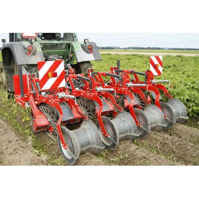 Via the spring-loaded haulm guides the haulm is brought to the intake drums along with a small amount of ground that is directed to the pull discs. Next to the pull discs are stainless steel gliders that prevent potatoes from being pulled out of the row. As soon as the flow of haulm with ground leaves the pull discs it is guided to the diabolo rollers which then gently press the loose ground. The result: Well-covered potatoes and a well-closed rows which are resistant against weather influences.