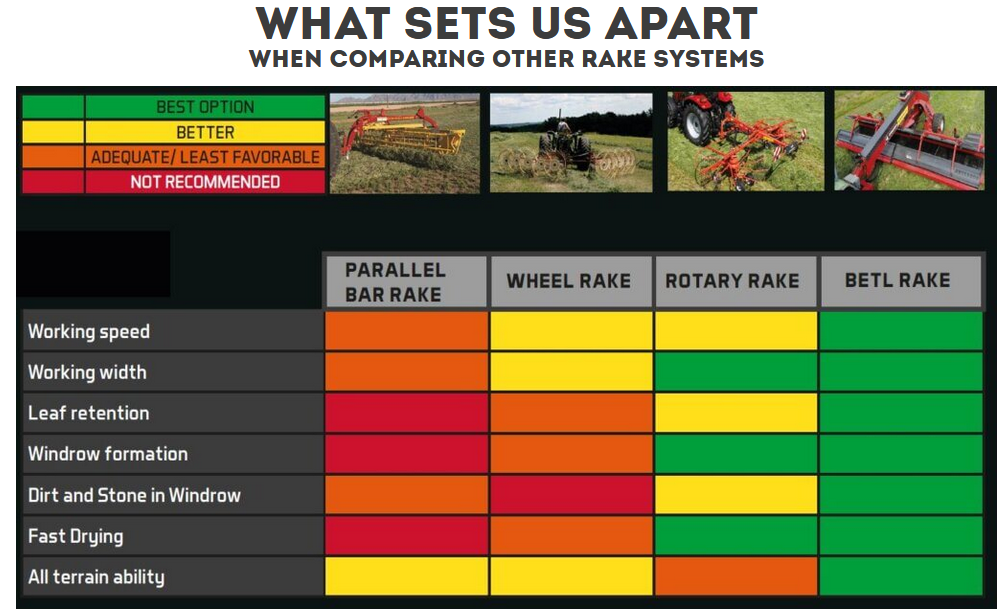 For the same raking width as a rotary rake, belt rakes are much more compact in size, making them much easier to use and store. Their stability and weight also make them easier for your tractor to lift, making transport and navigation of rough roads simpler and making them ideal for working in tight spaces.