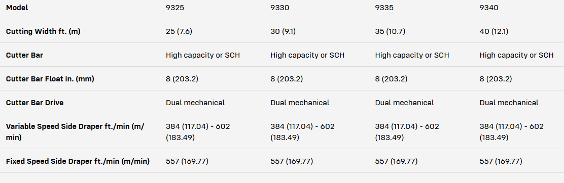 Headers feature two cutting heights for optimal grain harvest across variable field terrain and different crop types, including a rigid high cut option for canola or wheat and a flex low cut option for soybeans. The 9300 Series also offers optional factory-installed transport wheels for easy field-to-field transportation.