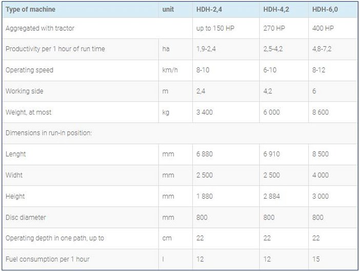 Heavy-duty disc harrows HDH-2,4, HDH-4,2, HDH-4,2-01, HDH-6,0 are designed to break up weed and crop residues (including pediculate plants such as: sunflower, corn) for cultivating soil after the harvest. The harrows are equipped with the discs 800 mm in diameter that are 300 mm from each other. Reliable discs fixing excludes scrolling of the discs, and the disc-section holdings have the working tools for changing the disc approach angle from 0° to 25°. There is the back towing hook that makes it possible to use the harrow together with other aggregates, and the special “cleaners” clean axle spacing from ground, weed and crop residues.