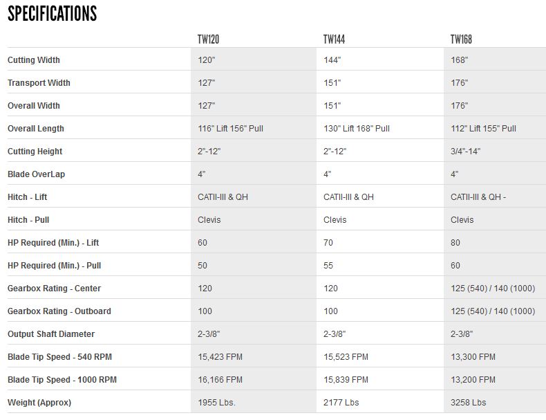 The TW144 cuts a full 144" swath. The 120 HP center gearbox transfers power to the 100 HP outboard gearboxes. The pull-type unit requires a 55 HP tractor (min.) and the lift-type unit requires a 70 HP (min.) tractor (with adequate front weights).