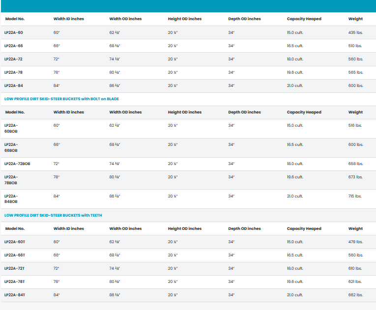- Choose from buckets widths of 60″, 66″, 72″, 78″ and 84″