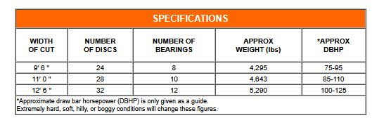 1 1/2` Cold Rolled Square Gang Axle.Double Tapered Roller Bearings. Rigid or Spring Bearing Hangers with Wear Guards.Disc Blades, 24` Diameter C/O or SM.Disc Spacing, 9 1/2`.Dual Wheels.Lifting Hydraulics.Heavy-Duty Tube Mounted Scrapers.Cover Discs with Scrapers.Self-Leveling Frame.Mechanical Transport.Reversible Tongue Clevis.Gang Wrench and Tongue Jack.