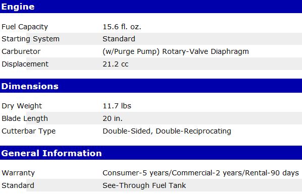 21.2 cc professional-grade, 2-stroke engine for outstanding performance.20` double-sided, double-reciprocating RazorEdge™ blades are precision ground and laser cut for long-lasting sharpness.Commercial-duty air filtration system for long engine life.Large ergonomic front handle with safety guard for increased comfort and control.Large rear handle provides comfort and great control.Rigid support bar allows straighter and more precise cuts.Tool-less air filter cover for easy access