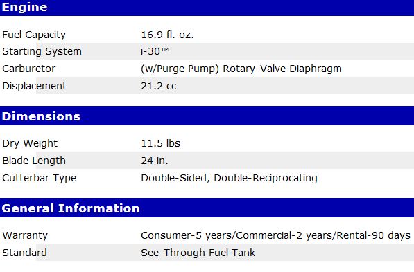 21.2 cc professional-grade, 2-stroke engine for outstanding performance i-30 starting system for reduced effort starting 24` double-sided, double-reciprocating RazorEdge blades are precision ground and laser cut for long-lasting sharpness Redesigned gear box provides dependability and durability Commercial-duty air filtration system for long engine life Ergonomic front and rear handles for a comfortable grip