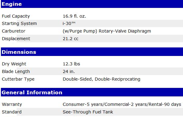 21.2 cc professional-grade, 2-stroke engine for outstanding performance i-30™ starting system for reduced effort starting 5-position rotating rear handle for a variety of cutting positions 24` double-sided, double-reciprocating RazorEdge™ blades are precision ground and laser cut for long-lasting sharpness Vibration-reduction system isolates front and rear handles from the engine and gear case for operator comfort Commercial-duty air filtration system for long engine life