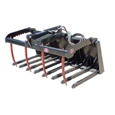 Heavy duty frame. 32” Tines are sleeved and constructed of 1 ½” square stress shaft. Tines tapered for easy penetration. Reinforced heavy duty universal mounting brackets; gusseted top and bottom for extra strength. Single 2”x 8” hydraulic cylinder. Grapple consists of four 24” curved conus tines. Includes flat faced couplers and hoses with built in orifices.