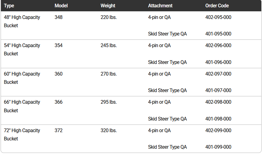 - Premium, high-capacity bucket for loaders with lift capacities up to 1500 lbs.