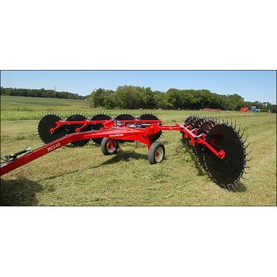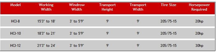 The HCI High Clearance Rake with independent rake arms is a ultimate full feature rake. Proven compound angle folding design along with wide stance and the low profile, allows for compact and stable transport. Easy adjustment of spring tension on each individual rake arm, as well as easy adjustment of Windrow width and rake wheel angle for all crop conditions. Standard Hydraulic Flow controls and easy wing adjustment for greater windrow adjustment. Dual center splitter and single kicker wheels optional.