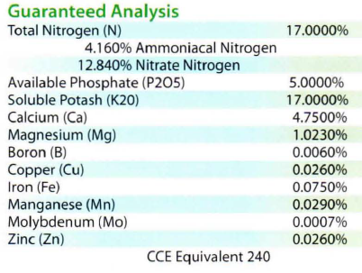 17-5-17 High Nitrate Plus Calcium is a low phosphorus, high nitrate, no urea formula. It has a complete micronutrient package with extra calcium and magnesium. This is an excellent formula for pansy and other bedding plants, and is recommended by leading pansy experts.