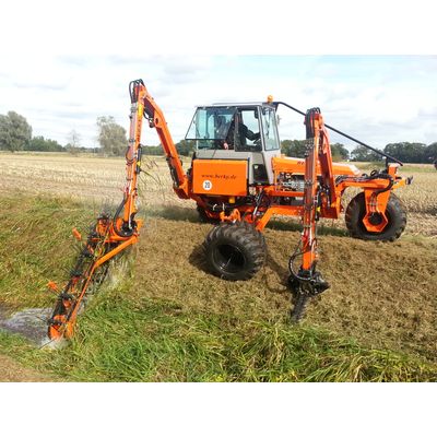 The BERKY Tricycle ditch slope mower model 2200 can be equipped with up to 2 working boom which have a range of up to 6.50 m. In addition, due to a parallelogram a third operation equipment can be mounted on the slope mower. Even at long ranges, the slope mower has a high stability. Depending on the design, the mower has various implements such as double-knife cutting unit, clearing rake, chopper, tree saw, backhoe and clamshell bucket, mowing bucket, which can be used for different working situations.
