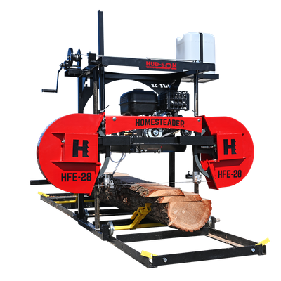 Hud-Son HFE-28 Great Everyday Sawmill for the Homestead. Heavy-duty 1 1/2” shafts and bearings. Produce lumber at any dimension. Manually adjust board thickness, even paper-thin cuts. Effortlessly guide mill through log. Lightweight & compact; store in space 3’ x 7’.