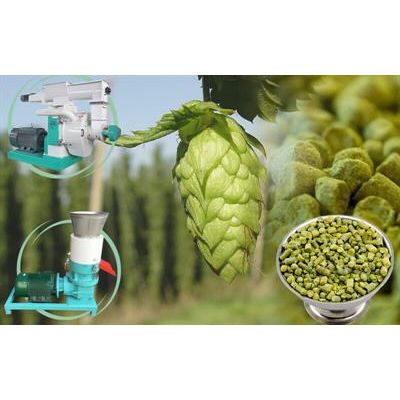 Make hop pellets with hops pellet mill- a pellet machine that includes a die and roller. The die is a metal plate with holes drilled through it and the roller goes across the die. Dried hops enter the pellet mill and are squeezed by the die and roller. The resulting pressure compresses the material and extrudes it through the holes in the die. The die can be flat die or ring die. Either type can be used to make hop pellets. For ring die pellet mill, you should use feed ring die pellet mill to make hops pellets, as it produces less heat during pelletizing than wood ring die pellet mill, thus protecting hops nature. There are two kinds of hop pellets produced: Type 90 and Type 45. For Type 90 the hops are simply cleaned and dried and then ground. Type 45 pellets undergo a more complicated process.
