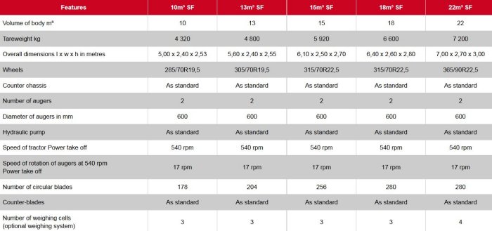 2 horizontal augers rotating in opposite directions, with reversed flow and out-of step threads.Augers Ø 600 mm.Reversible circular blades bolted onto each auger.2 oversized reduction gearboxes to drive the 2 augers (50% less effort per auger) Bottom of body reinforced with wearing plate.Body mounted on an independant chassis constructed in reinforced tubular profiles.Rear panel mounted on hinges.Right-hand side discharge as standard.0.86 m conveyor belt.PTO shaft security bolt.Rear lights.Mechanical support leg.Hydraulic pump with spare oil tank.Hydraulic distribution with manual controls mounted on an adjustable bracket.Trap with manual slide opposite to discharge conveyor belt.Exclusive “SILOFARMER” patent.Double augers rotating in opposite directions, with reversed flow and out-of step threads.