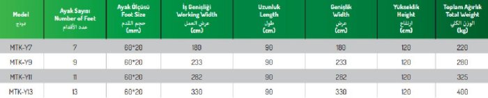 Model : MTK-Y7. Number of Feet : 7 . Foot Size : 60*20 . Working Width : 180 . Length : 90 . Width : 180 . Height : 120 . Total Weight : 220.