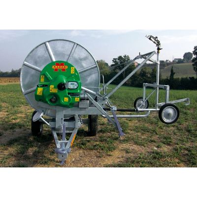When a farmer thinks of a hose reel, he has ours in mind - and the cost of operation-maintenance ratio. Mechanical lifting device of trolley. Telescopic mechanical feet. Gearbox. Power take off. Turbine flanged on the gearbox with external by-pass. Flexible connection pipe. Galvanized raingun trolley mounted on variable track wheels. Raingun. Set of nozzles HYDRA raingun from Ø 12 to Ø 16. Set of nozzles ROYAL raingun from Ø 16 to Ø 22. Pressure gauge (glycerine bath). Winding handle. Computer Aqua System. Safety guards. 2 wheels mod. 165/55 R14 4F. Hot galvanized chassis and turret. Hot galvanized reel. Polyethylene hose made by unadulterated raw material.