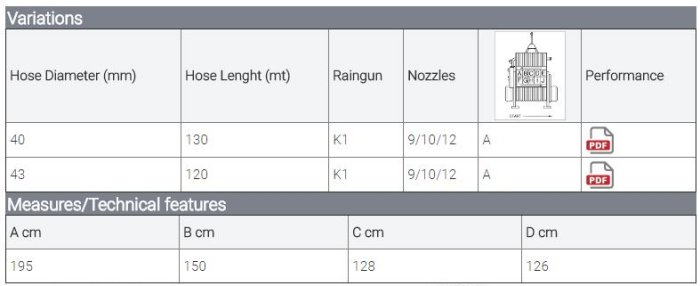 Professional irrigators for soft, lush turf like your neighbour`s. Turbine flanged on the gearbox with external by-pass. Gearbox. Hose-guide system. Galvanized raingun trolley. Raingun Set of nozzles K1-23-000 raingun from Ø 8 to Ø 10. Pressure gauge. Power take-off for fast retraction. Flexible connection pipe. Hot galvanized chassis and reel. Safety guards. 1 front wheel mod. 13.5.00 x 6" - 2 rear wheels mod. 15.6.00 x 6" 4F. Polyethylene hose made by unadulterated raw material.