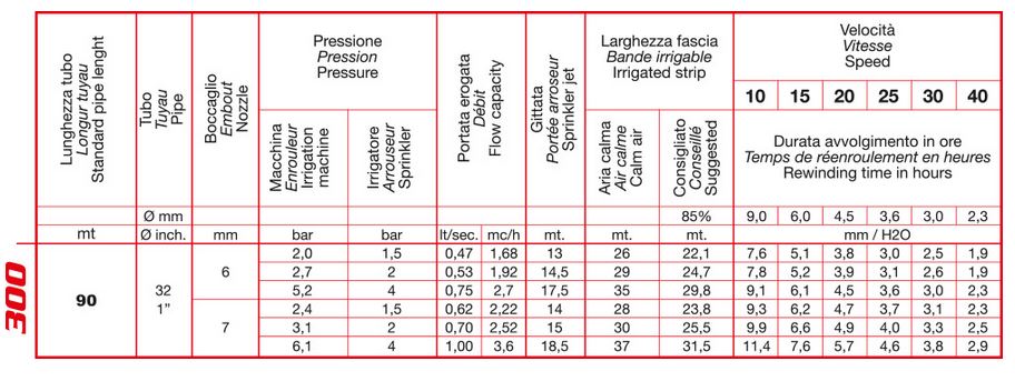 The machine rewinds the hose while irrigating. It works with a variable inlet pressure from 1,5 BAR min. to 6 BAR max. (got from water system, submerged pumps, and so on...). The rewinding speed is adjustable in order to distribute the right quantity of water on the field.