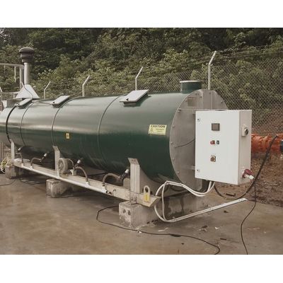 The HotRot 1206 can be outdoors in temperatures down to minus-20 degrees Celsius. However, as feeding is generally a manual operation, it is typically recommended that the unit is placed under a roofed area for worker comfort and protection in inclement weather. The standard unit is supplied with a bin-lifter feed unit but can also be provided with an integrated dewatering unit for increased capacity. The HotRot 1206 unit consists of a steel/stainless steel insulated hull. A stainless steel central tine-bearing shaft runs longitudinally through the vessel. This shaft is rotated periodically and provides mixing and aids aeration. Aeration is further enhanced by periodic air injection using a low-pressure system mounted external to the hull.