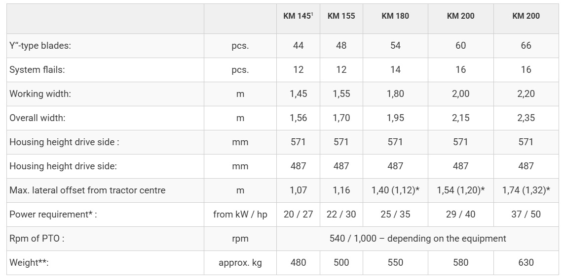 The KM flail mulcher is designed for universal use. The extremely flat design and the lowered drive are ideal for the use in fruit growing. The serial 3-point parallelogram sideshift adjustment with large setting range allows lateral extension at the tractor. A powerful model for mulching and shredding prunings. As the KM is mounted closely to the tractor, the weight distribution is advantageous and guarantees a good manoeuvrability. The mulched material is spread out evenly behind the rear roller.