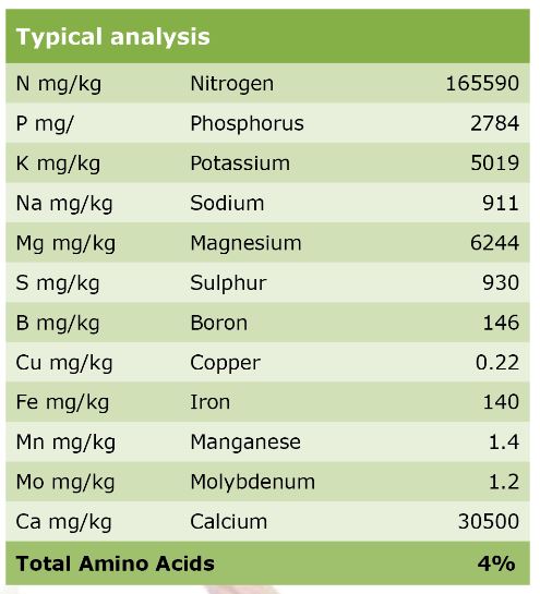 • L-isomer amino-acids; increase bio-synthesis of proteins, promote efficient plant growth and increase resistance to abiotic and biotic stress.
