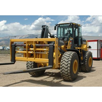 Rylind hydraulic adjustable forks are available with a 60” or 96” wide standard carriage. 120″ wide available for handling pipe or other larger applications. They are used to handle different types of pipe, lumber, logs, hay bales, palletized materials and many other applications. Visibility is excellent through the fork carriage from the operator’s seat to the load being handled. The hydraulic adjusting cylinders are direct acting and operate using the loader’s hydraulic third function valve. Heavy duty tine locks are standard to lock the tines back against the carriage. OEM Pin-on Mounts, Rylind Wedge-loc Coupler, Pin-loc Coupler, JRB, Volvo, Deere, CAT, ACS, and other coupler systems are available for all fork carriages.