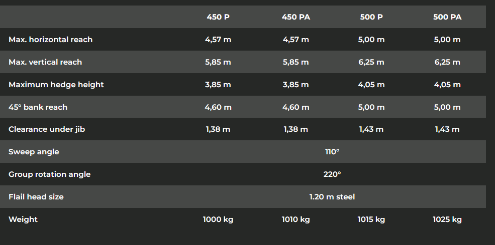 - Straight or forward arm 60 cm (PA) or 1.14 m between boom axis and rotor axis