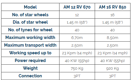 In this new model ‘’V’’ rakes the star wheels work inside the frame, avoiding obstructions under the arms as usually occurs in the common ‘’V’’ side-delivery rakes. Four big springs are assemblend on the frame to give more springiness to the same. We can assure you the high controllability and practicality of this side-delivery rake during the harvesting work, better than the ‘’V’’ rakes drawn on wheels. The transport maximum width is M/L 2,50 and the height is M/L. 3,20. The hydraulic drive of the star wheel holder arms allow to work with the side –delivery rakes in couples or singularly. Hydraulically, it is possible to adjust the working width: for model AM12RV from M/L 4,50 to M/L 6,70; for model AM16RV from M/L 6,30 to M/L 8,50. The side-delivery rake is supplied with 4/6 rotating and shock absorbing wheels, this allows better stability and working speed on uneven grounds.