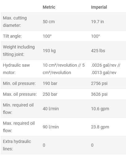 The felling grapple can be used to fell, cut, load and unload trees, branches and brushwood in forests, along roads, powerline corridors, and in park and urban environments. FG50FA is supplied as standard in the energy grapple version. It is then equipped with open grapple fingers (brush/energy wood grapple), 10cc saw motor and 59 centimetre saw bar, which can cut up to Ø50 centimetres. It can also be equipped with a special, 54 centimetre long saw bar (energy bar) to enable cutting of everything from shrubbery all the way up to large 45 centimetre cuts with more control of the chain’s tension when clearing brush.
