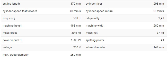 - Log splitter capacity 370 mm x Ø 250 mm