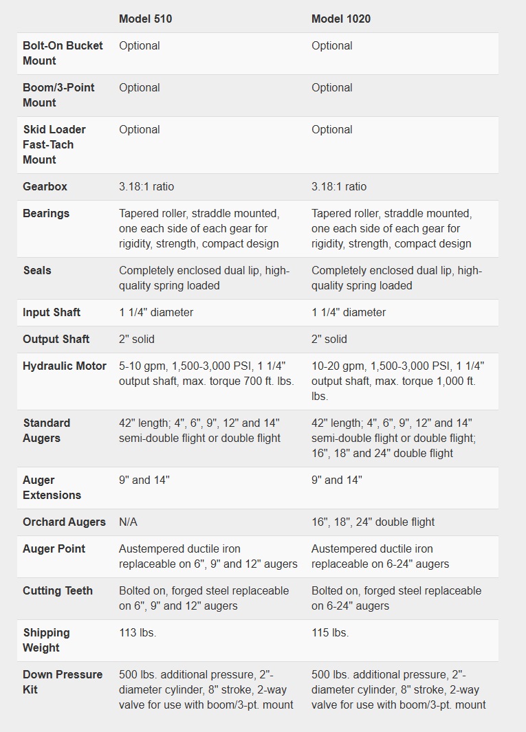 Both models feature a variety of auger width options ranging from 4 to 14 inches (24 inches on the larger Model 1020).