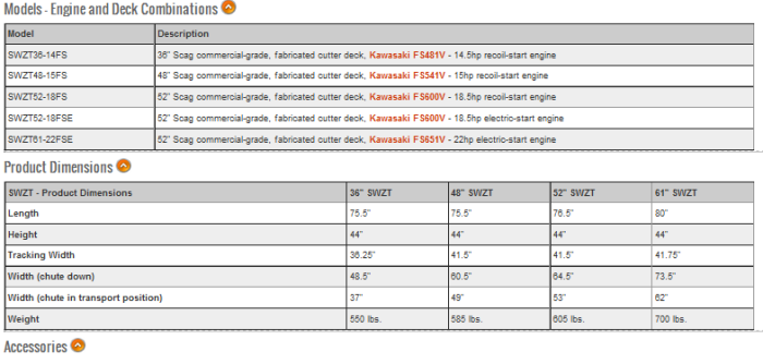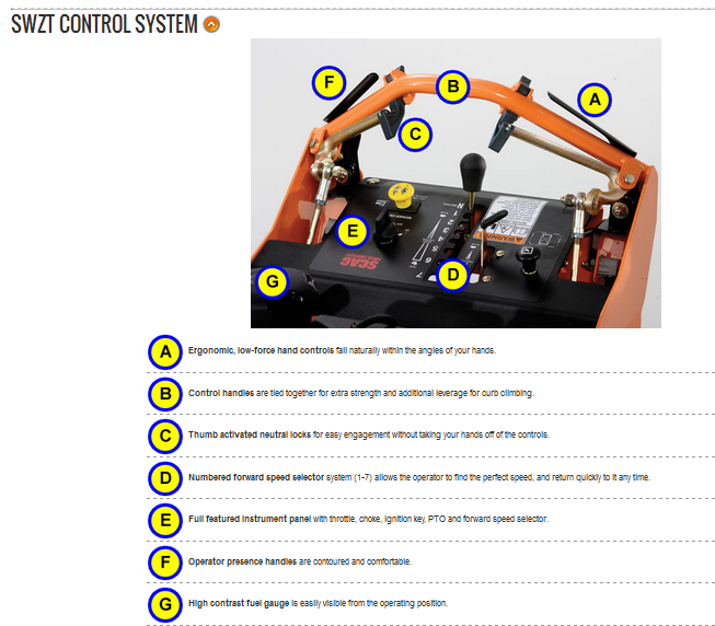 With Scag tough, commercial-duty 36", 48", 52" or 61" cutter decks, you will get the perfect cut, the first time, every time. Heavy duty construction, a floating style deck and great features like an integrated parking brake and the new control system set the SWZT apart from the competition.
