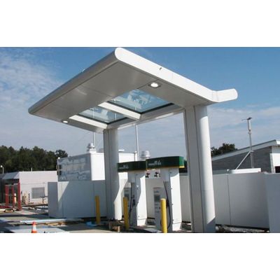 This Hydrogen Refueling Canopy offers a high tech look, complete with a glass panel roof and rolled ACM fascia. A sleek addition to your space. We guarantee durable, long lasting quality, and typically the quickest turnaround time in the industry. This model is available pre-engineered and custom made to your specifications. Contact us to discuss how we can meet your requirements.