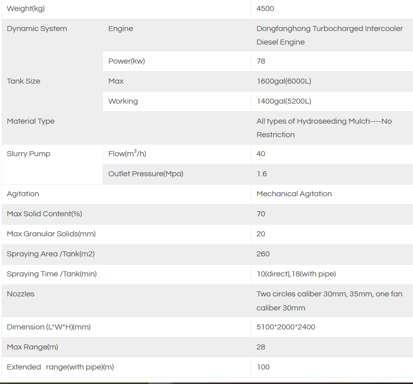 The machine mixer uses double mixing mode of vane mechanical agitation and cycling efflux agitation, to ensure that in the whole hydroseeding process, the slurry is in completely suspension and homogeneous state.
