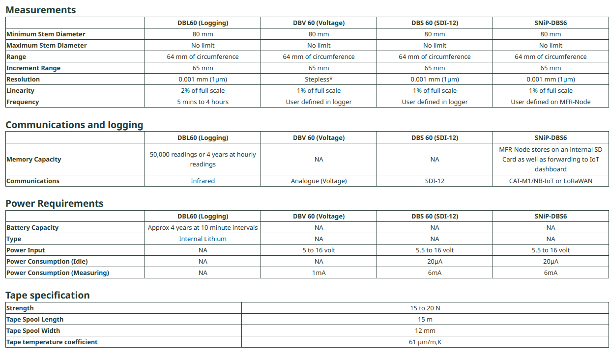 - DBV60 Voltage Band Dendrometer: Voltage signal output.