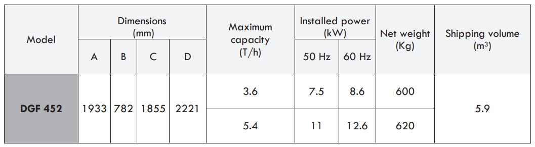 The performance of DGF can be optimized thanks to the possibility of varying the retention period of the product inside the machine by adjusting the advancing baffles positioned on top of the machine. Also, the machine permits dry degermination of maize eliminating the need for a drying system.