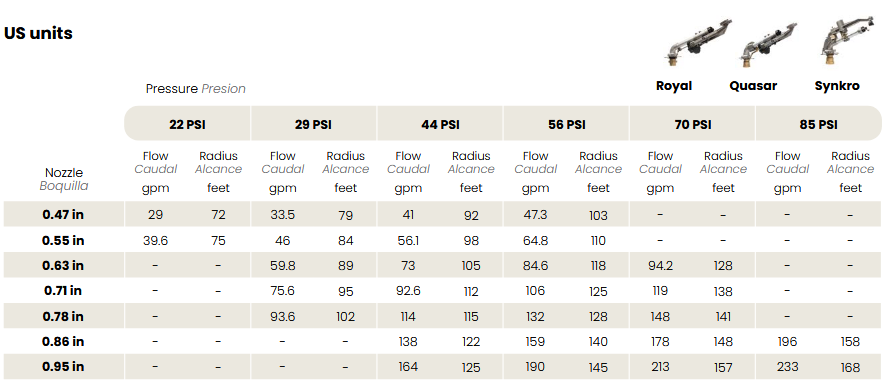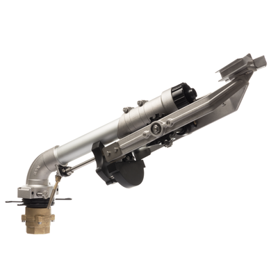 Slow reverse double arm gun for medium flow. Net weight: 7,8 Kg. Connection: Cod. 10497: 2” F. Cod. 10417 : 2” 1/2 F. Size: ø 1294 mm x 510 mm. Nozzle: Ø 12 ÷ 26 mm. Angle: 24°.
