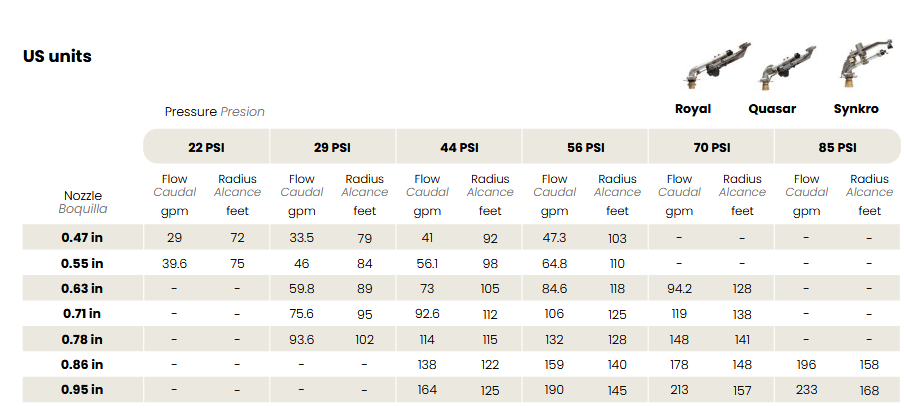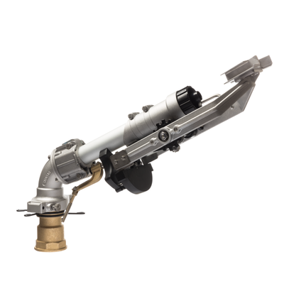 Slow reverse double arm gun for medium flow with adjustable trajectory angle. Net weight: 8,5 Kg. Connection: 2” 1/2 F. Size: 15°: ø 1336 mm x 412 mm,  27°: ø 1260 mm x 519 mm. Nozzle: Ø 12 ÷ 26 mm. Angle: 15° ÷ 27°.