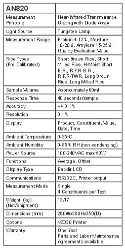 This simple-to-use instrument measures protein, amylose and moisture content in rice. The AN820 is factory calibrated to handle short, medium and long grain brown rice as well as milled rice.  Even high moisture brown rice can be accurately measured.  In addition to the three components, the AN820 provides an overall quality assessment (QEV) to help you determine the value of each rice sample and scientifically manage the taste of rice. Accurate measurement is achieved without pre-processing the samples by husking and grinding that is often required in competitive devices.  This dramatically reduces the overall test cycle allowing you to focus on improving product quality and not on sampling and prep work.