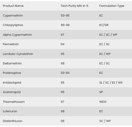 Bifenthrin 95EC, SCFipronil 92EC, SC, WPEmamectin Benzoate 95SG.