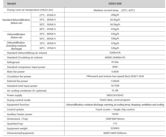 Features: Quick Installation and Use: The device is in place and connected to the power supply, ready to use. Dry Evenly: Adopt forward and reverse flow through form to make the material dry evenly. Performance Ratio Increased by 20%: Separate design of circulation air volume and dehumidification air volume, so that performance ratio increased by 20%. Small size and large capacity: Loading capacity is about 4.5m³. Food Grade Stainless Steel Customization: The inner partition and outer shell are made of SUS304 stainless steel to satisfy with food drying. Customized by N0n-red Copper Pipe: Evaporator and condenser are made of non-red copper pipe, complied with special corrosive application environment. Standard Rated Condition: Dehumidification performance ratio (SMER) is more than 3.5kg. H2O/kw.h.
