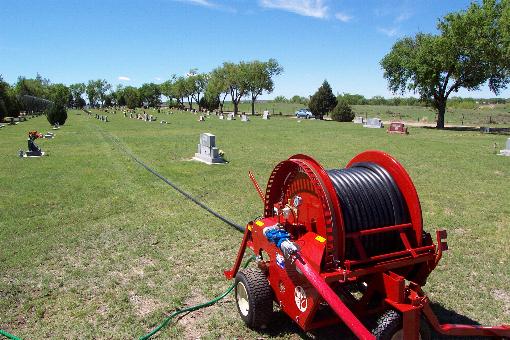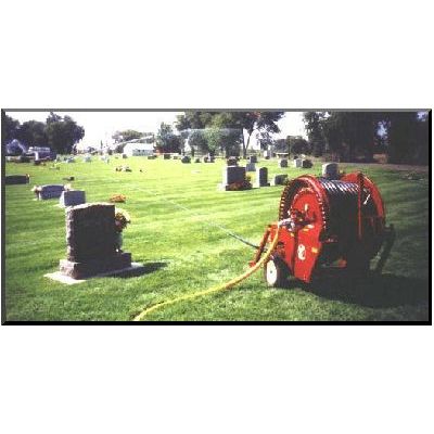 Reel irrigators are excellent choices for cemetery irrigation on old or new cemeteries. The sprinkler and cart can operate around monuments or obstacles. The moving sprinkler irrigates around monuments, or trees, from all angles, providing coverage front, sides, and back as the sprinkler passes by. Waterreels do not require trenching underground pipe that may interfere with future internments, or disturb existing ones. Coverage is easily expanded when needed.