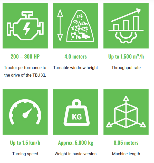 The TBU XL is the optimal machine when it comes to turning compost windrows up to a height of four meters quickly and reliably The restacking procedure is performed in a space-saving way by cutting off compost flanks and moving the cut material to a parallel windrow. The TBU is driven by the power take-off shaft with three-point hitch of a powerful tractor.