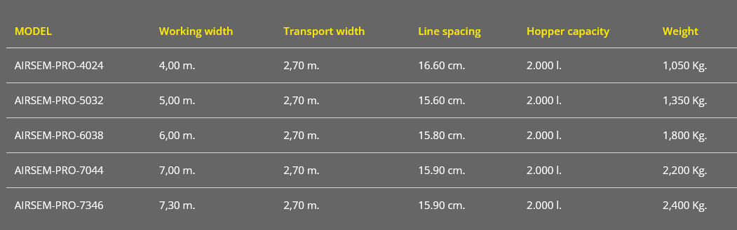 AIRSEM: Conventional pneumatic overhead seed drill for all types of seeds with high precision volumetric distributor. Seed drill with wheels on the wings to adapt to the irregularities of the terrain. Drive wheels located behind the tractor wheels allow smooth and continuous movement when rolling over a compacted surface, as well as perfect depth control. Large hopper capacity of up to 2,000l, which does not imply a great effort for the tractor due to its location on the hitch, which allows more autonomy with less effort. The 4-row model allows working in soils with a high accumulation of residues. It can be assembled with up to 4 different types of furrow openers.