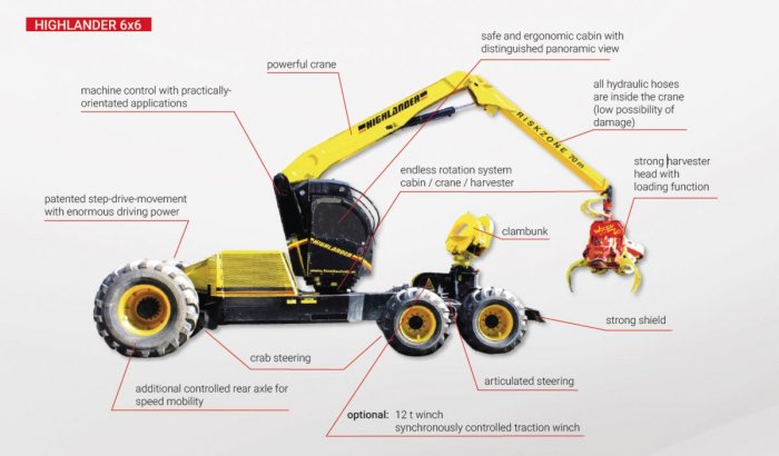 A Quantum Step in Mobility and Flexibility. The new innovation Highlander is a high-performance harvester for middle and strong sized timber. In normal harvester terrain, the HIGHLANDER can move with special maneuverability. In steep and extremely diffi cult terrain, the machine reaches an enourmous terrain flexibility due to the syncronised step and drive movement. The HIGHLANDER offers more than the climbing ability of a trucked machine and the advantages of a wheel driven machine.