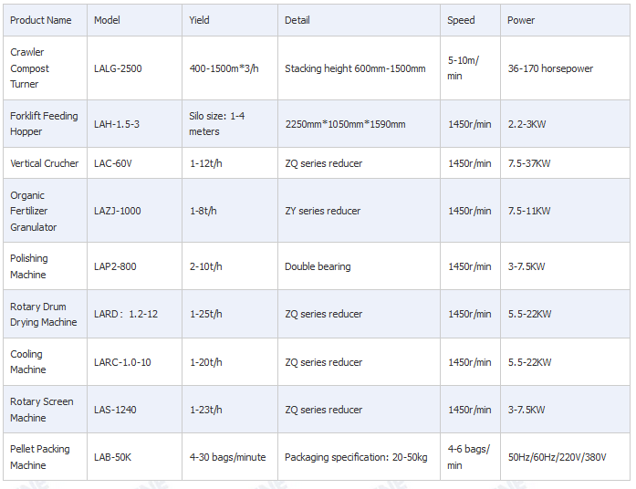 The following is the parameter list of conventional equipment for organic fertilizer production line, the specific model and output can be customized according to your needs.
