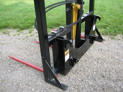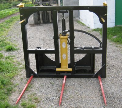 Designed to carry 3 or 4 large square bales. Hydraulic pusher to release bales from tines. Safety support to prevent bale fork from tipping when not in use.. 25` Tine spacing. 60` W x 54` H main frame dimensions. 60` W x 79` H total frame with extension. Hydraulic hoses included. Quick couplers sold separately.